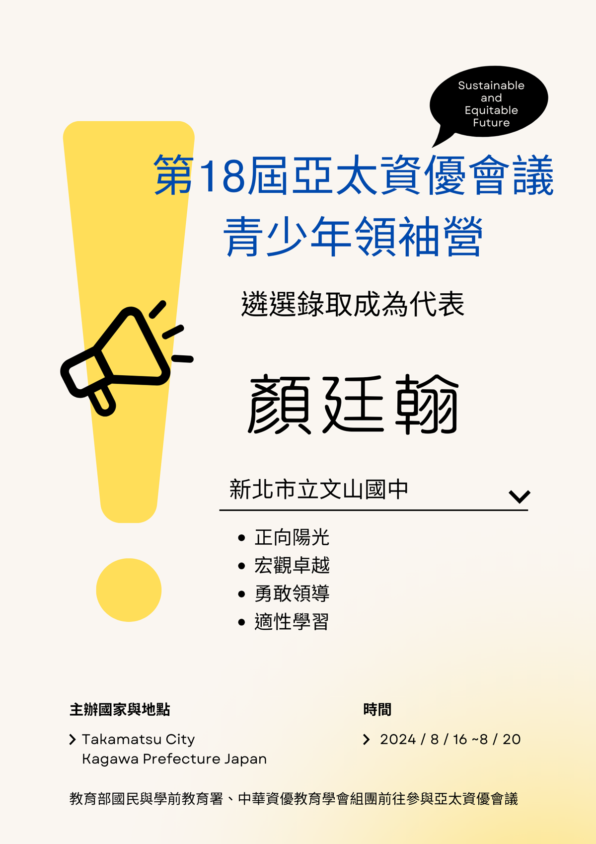 本校學生顏廷翰參與「第18屆亞太資優教育會議青少年領袖營」遴選,獲錄取為代表