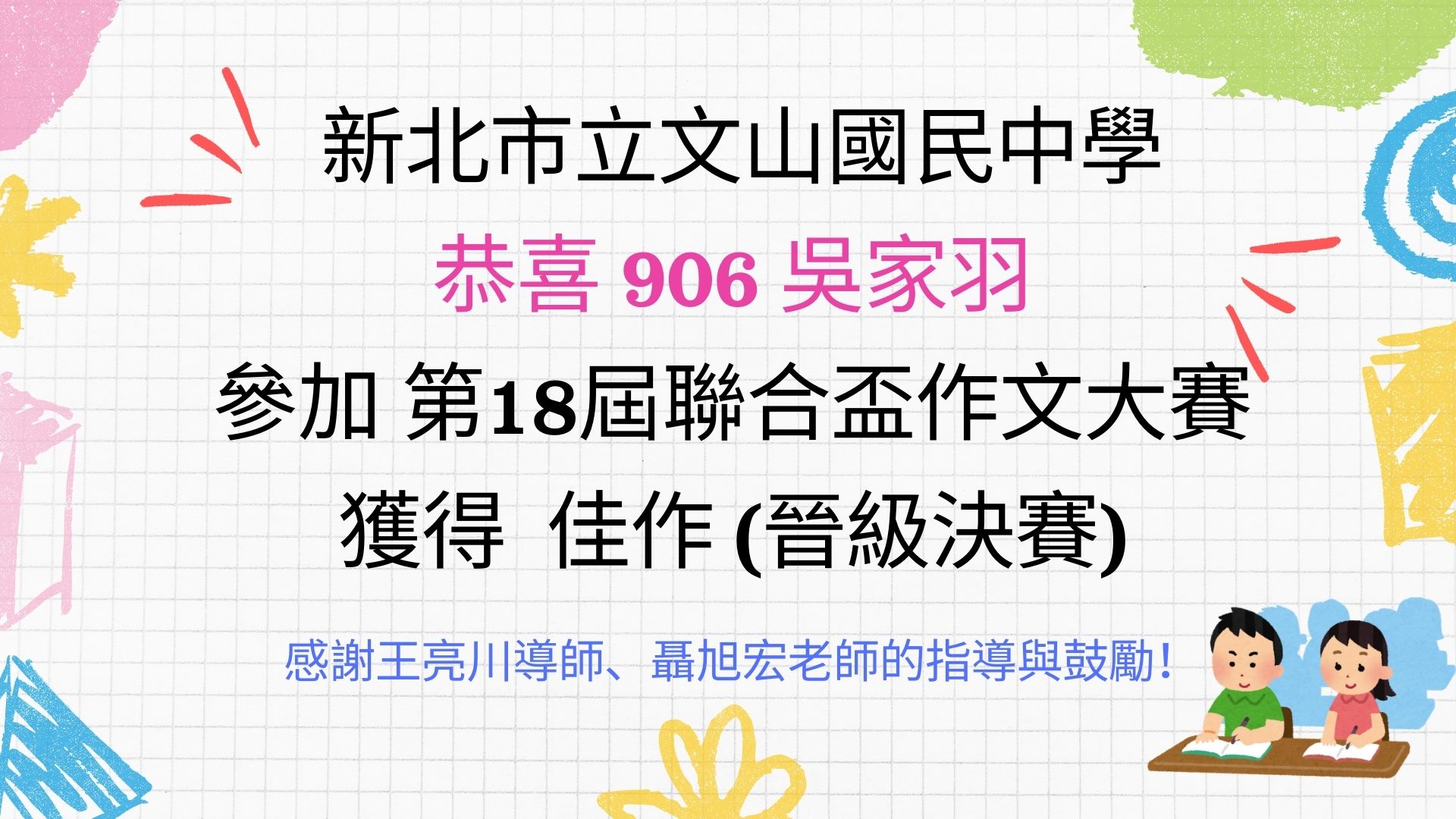 恭喜 906吳家羽同學 參加第18屆聯合盃作文大賽 獲得 佳作(晉級決賽)!