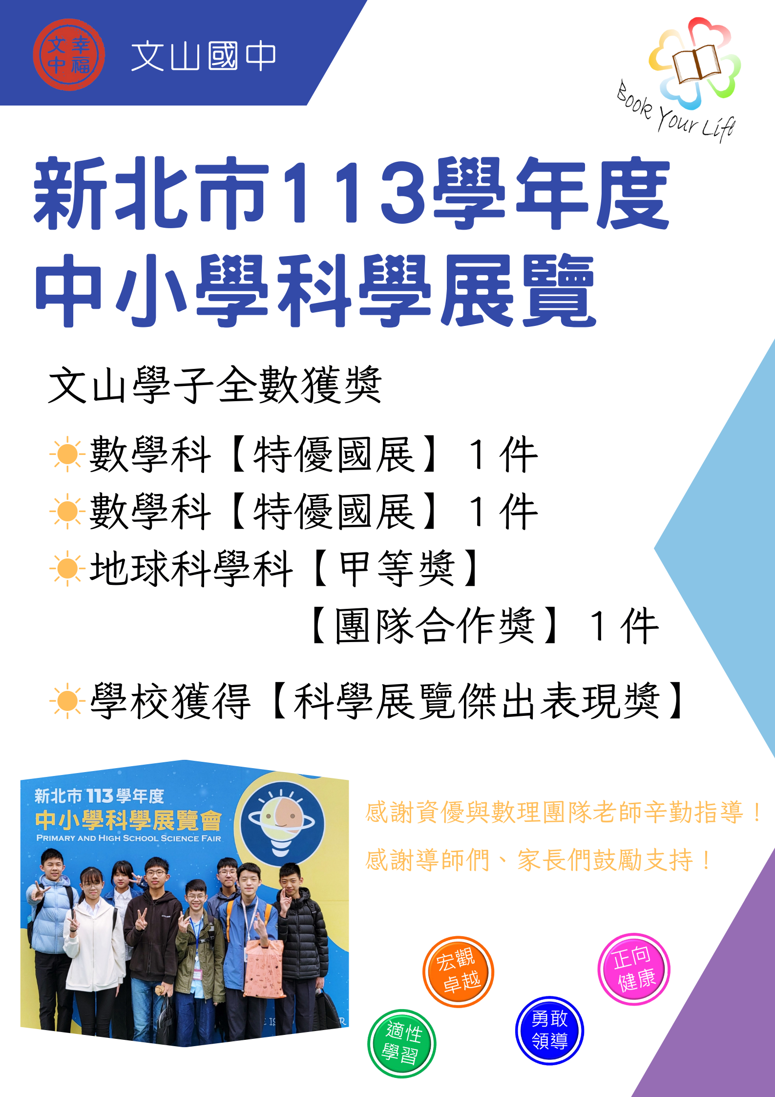 本校學生參加113學年度新北市中小學科學展覽會 全數作品獲獎!學校獲得「科學展覽傑出表現獎」!