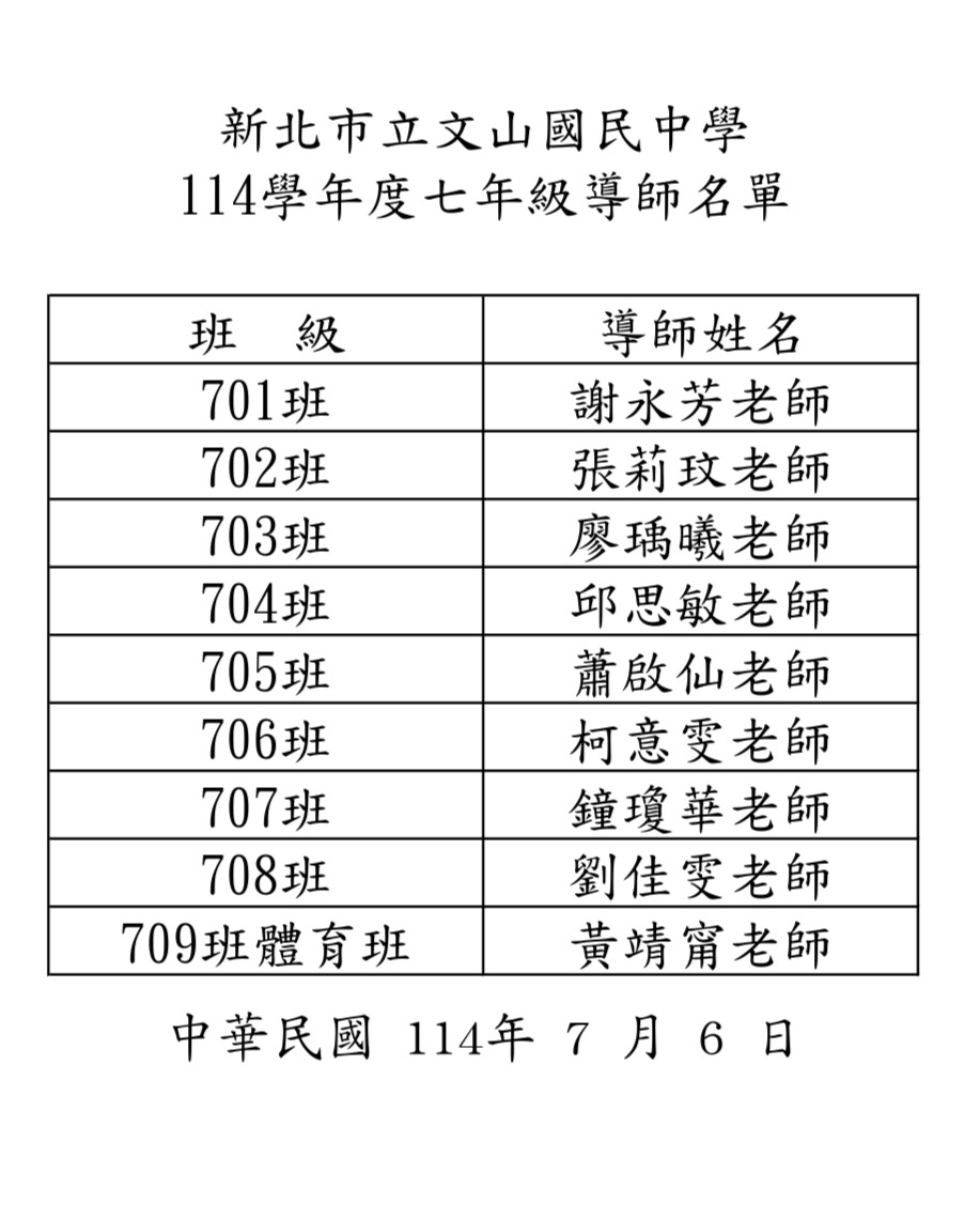 新北市立文山國民中學114學年度七年級新生編班名單暨導師名單(1140731更新補報到編班)